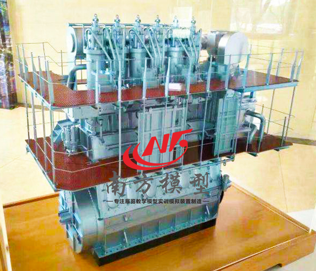 柴油機模型主要設備; 1:主要設備設施,由機座、主軸承、機架、導板、掃氣箱、氣缸蓋、活塞、活塞桿、 十字頭、連桿、曲軸、噴油器、增壓器等組成;整體比例協(xié)調、原理準確色彩靚麗、