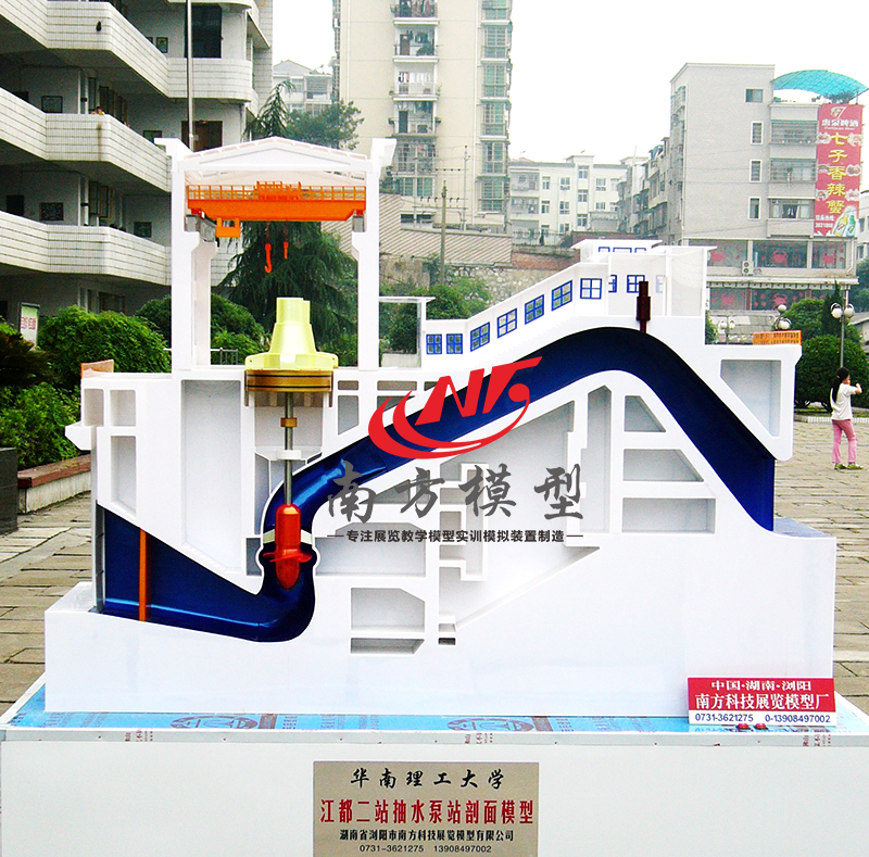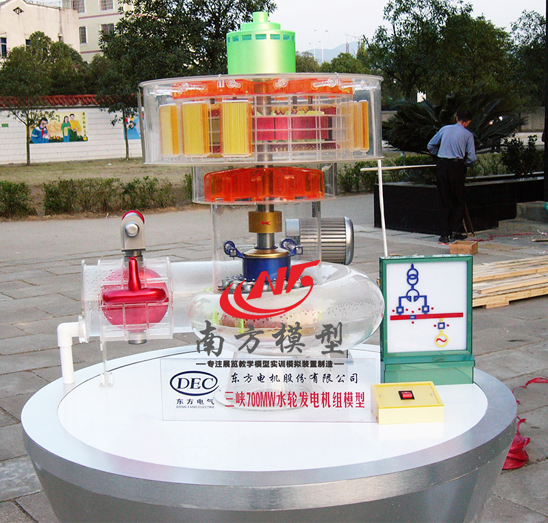 燈泡貫流式水輪機組的水輪機模型使用藍色箭頭與LED流水燈表示水流走向,水流進(jìn)入后從燈泡周?chē)鶆蛲ㄟ^(guò)到達轉輪,推動(dòng)轉輪旋轉做功后由尾水管排出。通過(guò)導葉角度與轉輪葉片角度的調整配合可使水輪機模型運行在最優(yōu)狀態(tài)。燈泡貫流式水輪機組具有結構緊湊、穩定性好、效率較高,適用于低水頭大中型水電站。