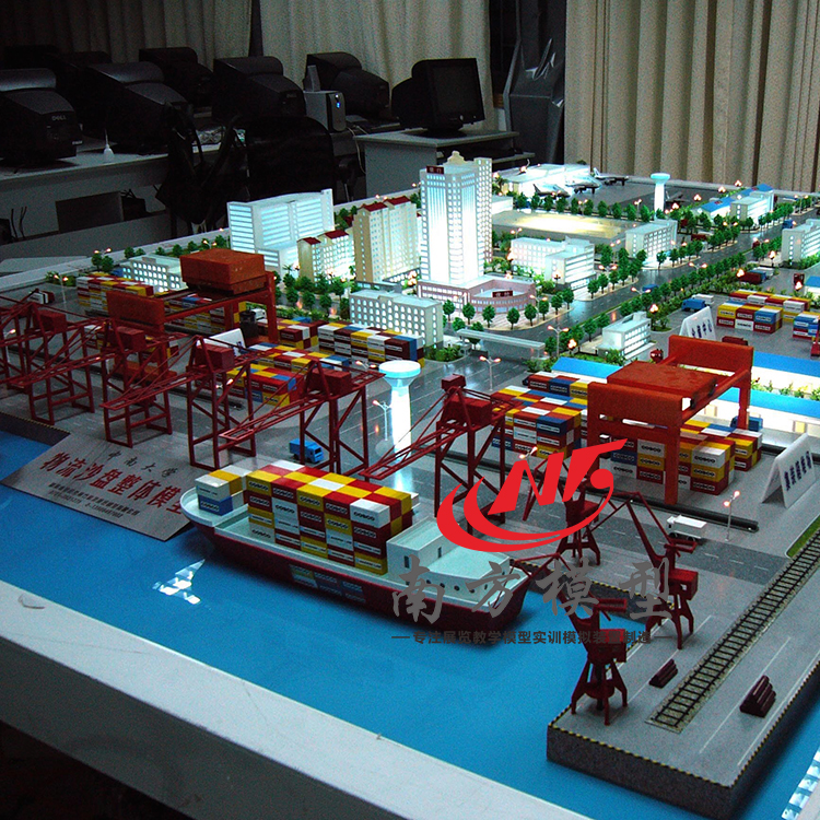 總體說(shuō)明:沙盤(pán)根據港口的實(shí)際地面布局通過(guò)沙盤(pán)形式體現出來(lái)。沙盤(pán)中將港口、船舶、港區、堆場(chǎng)、銀行、機場(chǎng)等比例縮小做成立體模型,其中港口上的有關(guān)設備:龍門(mén)吊、岸邊集裝箱起重機、門(mén)坐式起重機等能夠模擬仿真運行,燈光可以分區域分別控制,各個(gè)建筑物標識清楚。模型制作精致,美觀(guān)大方。