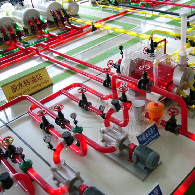 模型共布置有造氣段、脫硫段、壓縮變換段、銅洗脫碳段和氨合成及制冷段(含氨庫)等六個(gè)工序段。這六個(gè)工序段中的原料輸送機、大氣柜、氮氫氣壓縮機和透明循環(huán)機等大型機器設備都采用電動(dòng)模擬,發(fā)生爐、壓縮機管道、水洗氣管道、精制氣管道、合成氣管道、氣氮管道和液氨管道等,主要生產(chǎn)流程采用燈光流動(dòng)、模仿工質(zhì)動(dòng)態(tài)。各種不同用途的氣、汽、溶液管道和機器設備采用分色處理。另外,主要管道按照實(shí)物實(shí)際裝有安全閥模擬控制。使復雜的合成氨生產(chǎn)過(guò)程更明朗直觀(guān)化,強化了認知效果。該套裝置模型制作精巧、 逼真、設備齊全,設備位號清晰、 管線(xiàn)色彩鮮艷,按行業(yè)標準著(zhù)色, 便于掌握工藝流程走向, 管道內布有LED燈光, 演示合成氨的工藝流程。模型設有綠化帶,整體美觀(guān)實(shí)用。模型所采用的發(fā)光管都是有絕緣電路板、貼片LED發(fā)光二極管貫穿在管道中而組成,透過(guò)管壁均勻發(fā)光流動(dòng)。底座支架主要采用實(shí)木材料制作而成,外粘各色鋁塑板,進(jìn)行造形裝飾。盤(pán)面周邊用白色鋁塑板、底座主要以“湖藍色”大塊設色,間以牙白色帶圓孔的塊面和較寬的配色立體橫條造型,使整體豪華而堅固。根據具體需要制作成多塊組合形,便于拆裝搬運,且組裝靈活。