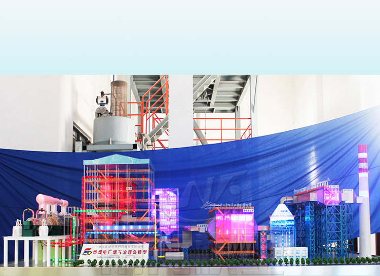 (1)煙氣脫硫(簡(jiǎn)稱(chēng)FGD)。采用濕法煙氣脫硫,包括吸收塔、增壓風(fēng)機、氧化風(fēng)機、漿液循環(huán)泵、煙氣換熱器(GGH)及管道附件等,吸收塔放大比例,外殼前半部分做成無(wú)色透明體以便看到內部結構、除霧器噴淋層(5層)。光電設計海水噴淋效果和海水流動(dòng)效果;曝氣、氧化氣可以冒出氣泡,流進(jìn)FGD的煙氣顏色與流出FGD的煙氣顏色發(fā)生變化,通過(guò)燈光顏色的改變來(lái)直觀(guān)模擬煙氣脫硫的過(guò)程。