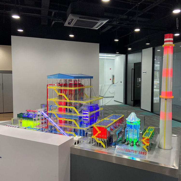 (1)整臺鍋爐外觀(guān)、回轉式空氣預熱器(2個(gè))、原煤斗(5座)、中速碗式磨煤機(5臺)、給煤機(5臺)、煤斗與給煤機磨煤機的連接管(5條)、磨煤機與爐膛連接管(20條)、汽水分離器1個(gè)、集中下降管、下聯(lián)箱、主蒸汽母管、冷再熱汽母管、熱再熱汽母管、一次風(fēng)機(2臺)、二次風(fēng)機(2臺)、引風(fēng)機(2臺)、煙風(fēng)道等,以上設備均用不同顏色的高級有機玻璃壓制成形。