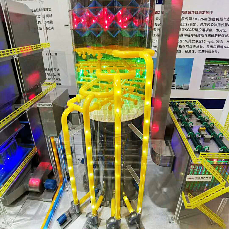 主要內容包括:反應塔(2)座及其噴氨設備、催化劑(3)層。光電設計噴氨時(shí)燈光顯示,流進(jìn)反應塔的煙氣顏色與流出反應塔的煙氣顏色發(fā)生變化,通過(guò)燈光顏色的改變來(lái)直觀(guān)模擬煙氣脫硝的過(guò)程。